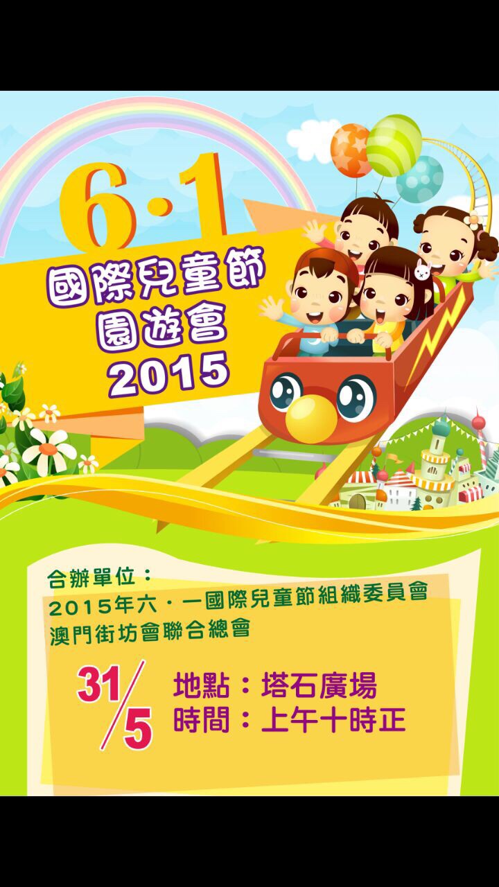 為慶祝六一國際兒童節,澳門街坊會聯合總會與澳門政府合辦「6。1國際兒童節園遊會2015」活動,希望透過大型的園遊會,讓社會大眾感受節日的氣氛,並透過當中的體驗,讓各界關注兒童的發展,培育兒童有健康的成長過程。為著有意義的活動,現招募義工參與,協助園遊會之攤位遊戲,讓活動能得以順利進行。