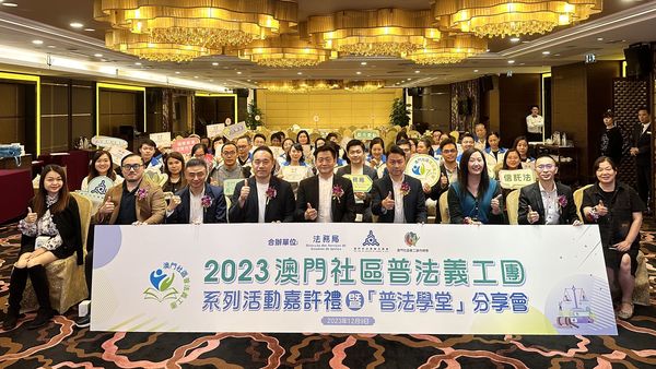 2023「澳門社區普法義工團」系列活動嘉許禮暨「普法學堂」分享會日前完滿舉行,活動的主要目的是建立一個平台,讓澳門市民能夠對法律知識有基本的了解,從而認識自身的權利和義務,並向社區宣揚正確的法律觀念。