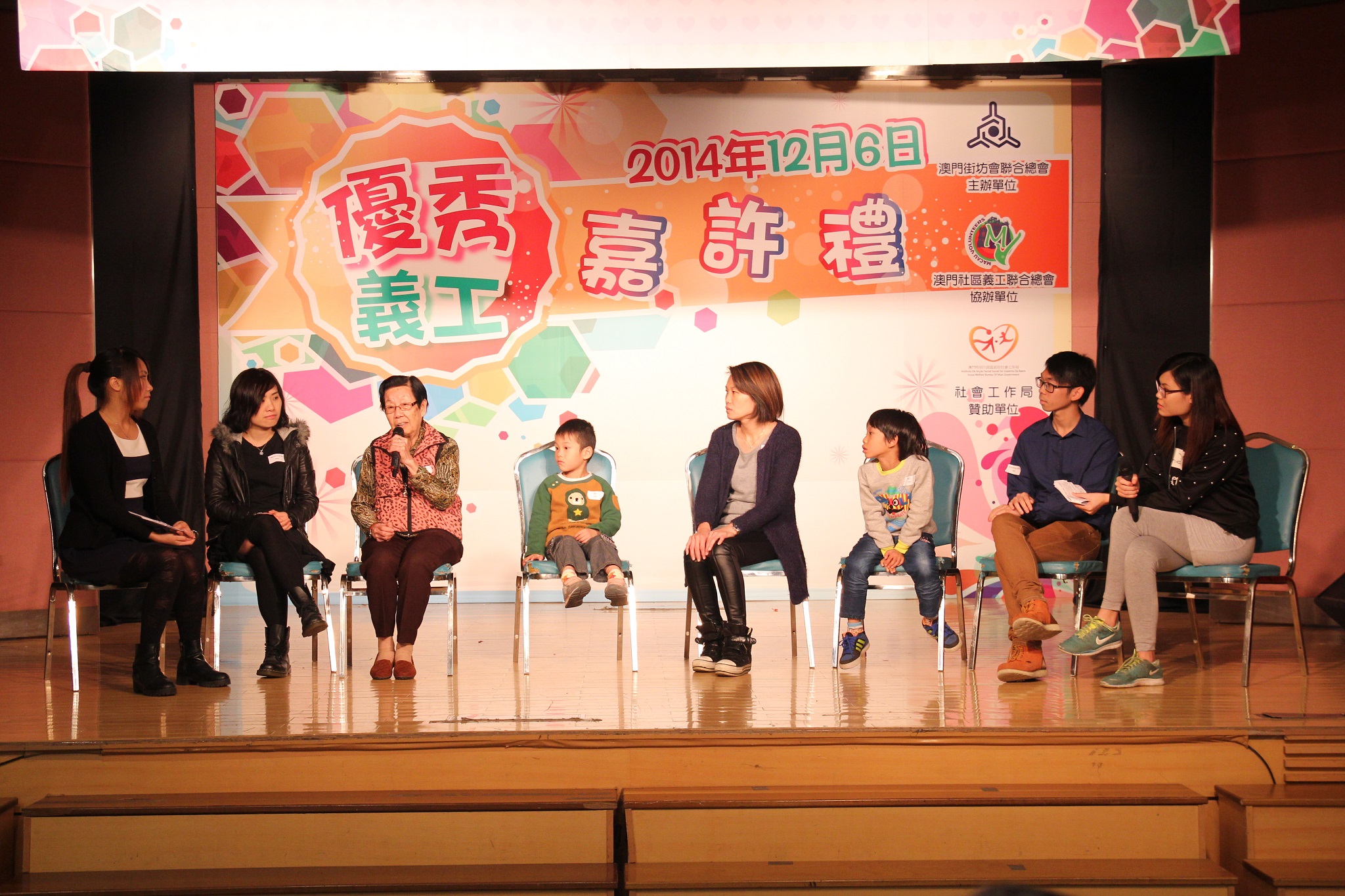由澳門街坊會聯合總會主辦、澳門社區義工聯合總會協辦、社會工作局贊助的“2014優秀義工嘉許禮”於日前在栢蕙活動中心舉行,有來自20多個不同社服單位參加,共91名優秀義工及4個優秀家庭義工獲嘉許,其中10人更入選為“十優義工”。主辦單位冀透過本次嘉許禮表揚義工的努力付出和無私奉獻,藉此提高市民對參與義務工作的認同,同時鼓勵更多社會人士參與義務工作,並宣傳義務工作的高尚情懷,把義務工作的理念向社區延伸,以實際行動承擔社會責任。
